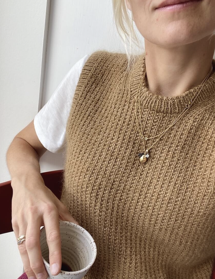 Der Friday Pullunder wird von oben nach unten in gebrochenem Rippenmuster gestrickt. Zuerst wird die Rückseite gefertigt, danach Schultern und Vorderseite, zuletzt der Rumpf. Entlang des Halsausschnittes und um die Armausschnitte herum werden Abschlussbündchen gestrickt.