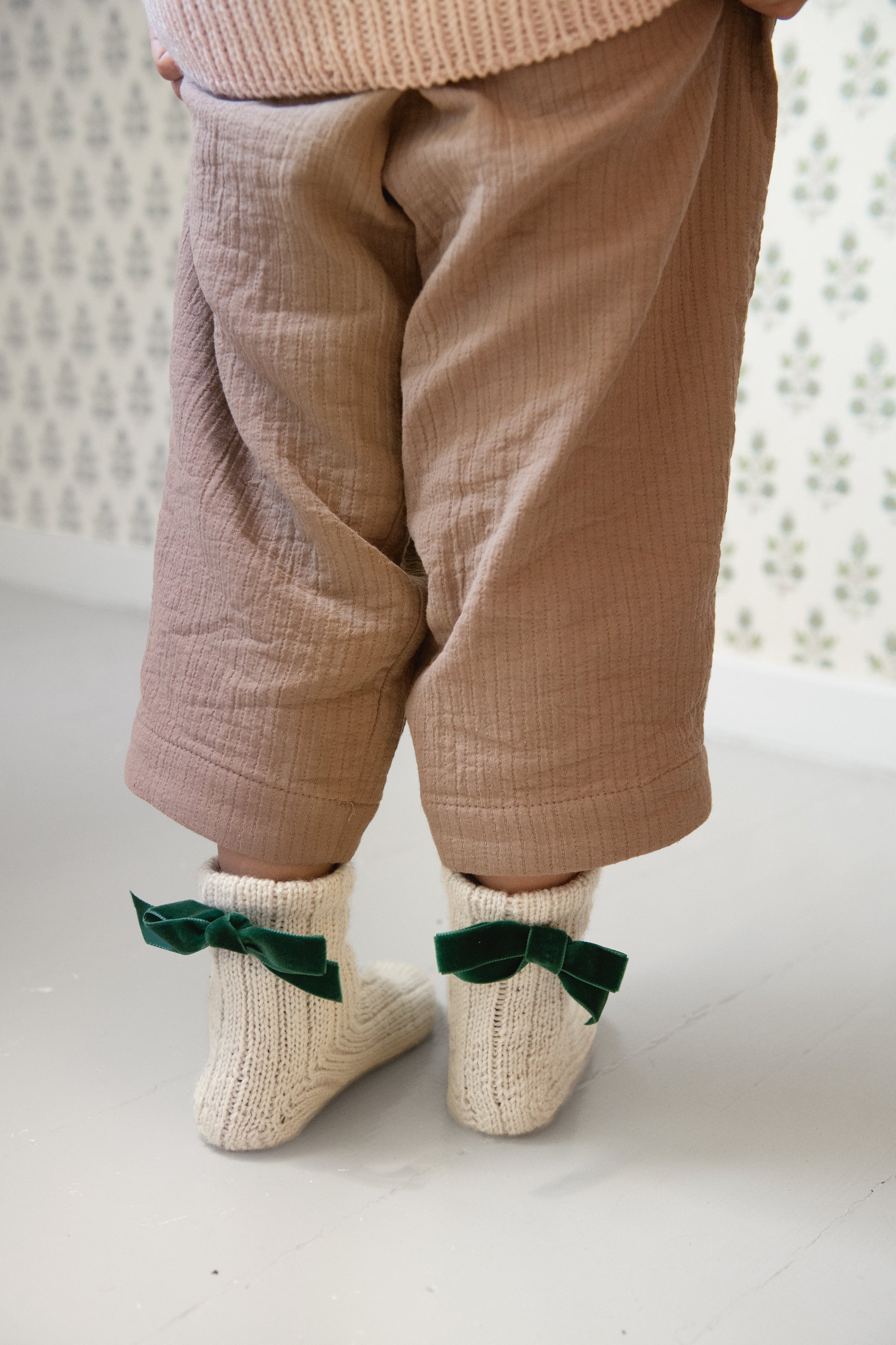 Die Ferse wird mit Wendereihen geformt, bevor der Strumpf bis zur gewünschten Länge rund gestrickt wird. Danach werden für die Fußspitze M in jeder Seite abgenommen, bevor die restlichen M mit Maschenstichen zusammengenäht werden, um einen schönen Abschluss der Strümpfe zu bilden. Zum Schluss wird eine Schleife aus Seidenband hinten oder an der Seite der Strümpfe fest genäht.