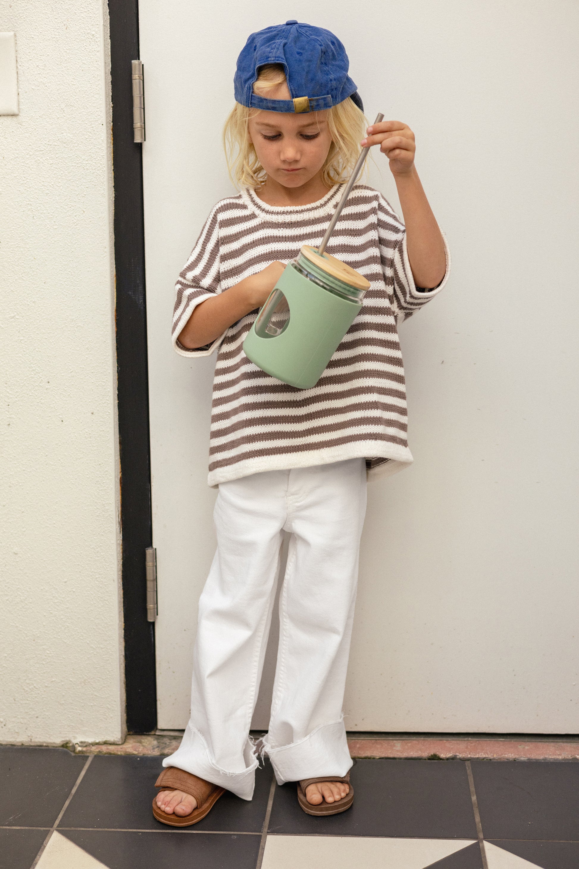 Das T-Shirt wird von oben nach unten in Streifenmuster mit MANDARIN PETIT gestrickt.